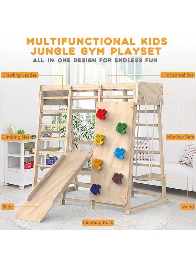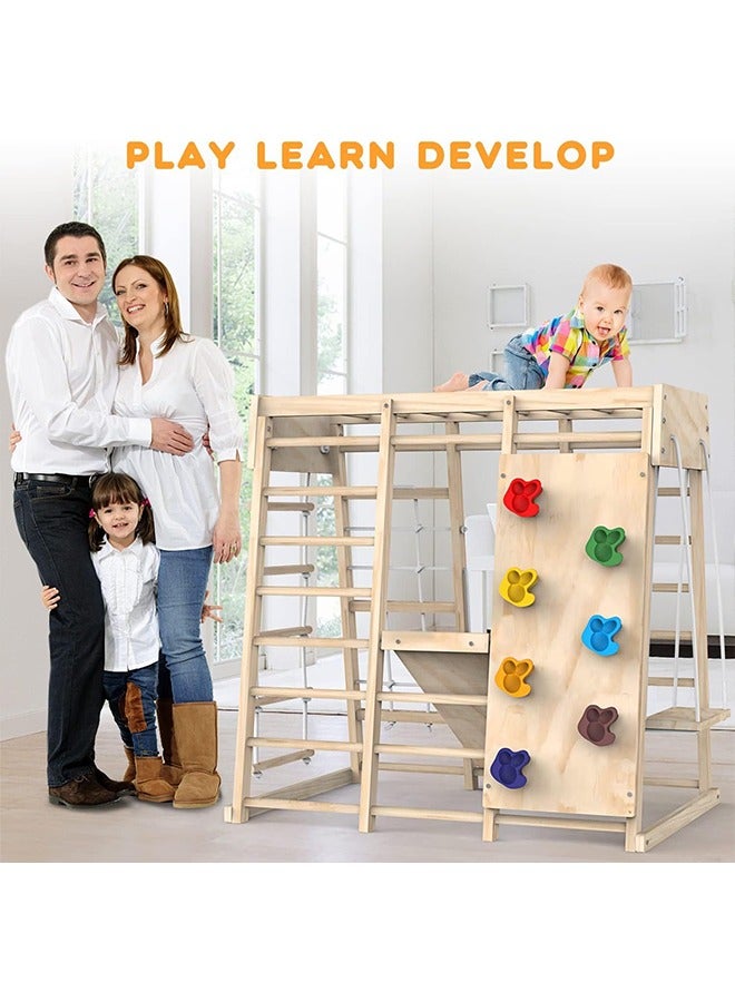 - 6 ألعاب في جهاز واحد: جيم التسلق الداخلي يجمع بين جدار تسلق صغير، زحليقة، سلالم خشب وحبال، ساحة قردة (Monkey Bars)، مرجوحة ولوح رسم! يعني طفلك ما راح يمل أبدًا وكل يوم يكتشف طريقة لعب جديدة.
